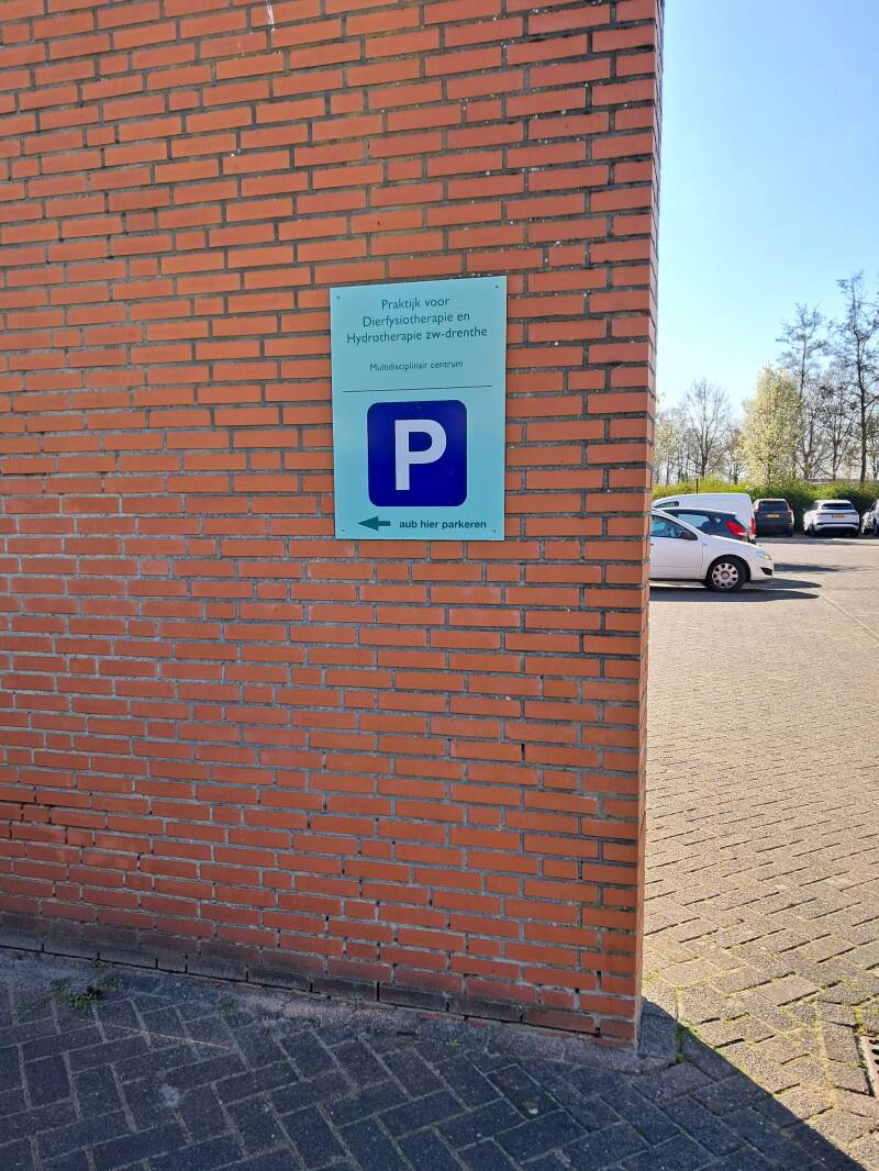 De ingang voor de Hydrotherapie is achter de praktijk van de dierenarts, volg het bordje dierfysiotherapie